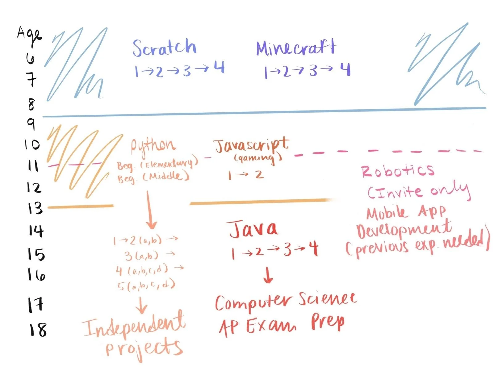 The Problem: A common complaint about Penguin Coding School’s Website is that it is confusing and hard to figure out what class to sign up for. Parents with little coding experience don’t know what the different classes teach and trying to decide which class is appropriate for their child is difficult. This affects Penguin Coding School’s conversion rate; we want more parents to sign up for classes and thus we need to make it easier for them to find the right one. And thus I set about trying to convey this information in one easy to understand graphic.